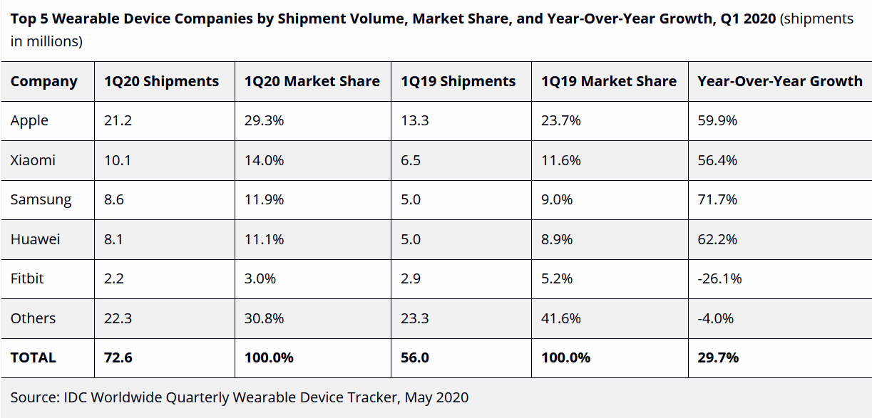 Аналитическая компания IDC опубликовала отчеты о состоянии рынка носимой электроники (смартфоны, планшеты, часы, фитнес-браслеты) в I квартале 2020 года.