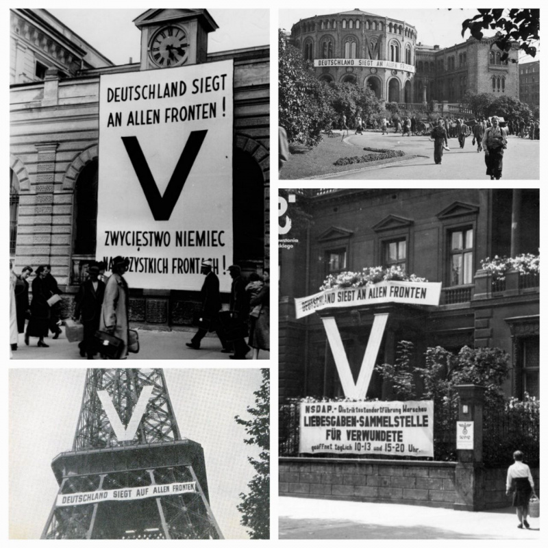 Немцы были не в состоянии подавить использование символа, поэтому они решили кооптировать его для себя. В июле 1941 года различные известные достопримечательности Парижа, включая Эйфелеву башню, Бурбонский дворец и площадь Согласия, были украшены массивной буквой "V" и сопровождающим ее баннером с надписью "Deutschland Siegt Auf/An Allen Fronten", что переводится как "Германия побеждает на всех фронтах". Подобные баннеры появились на достопримечательностях оккупированных территорий по всей Европе, в том числе на здании парламента Норвегии и на площади Пилсудского.