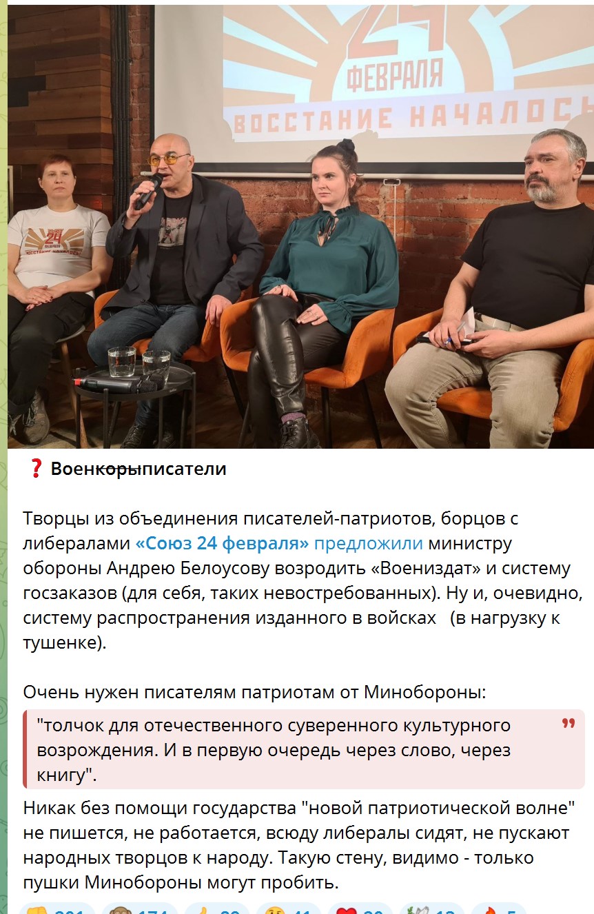 Вообще, если б она не была столь омерзительной нынче, как и владетели дум россиян, то образовавшийся дефицит вполне можно было бы заполнить творчеством максимально пафосного и идиотского вида. Технически ничего сложного награфоманить хоть повестей, хоть стихов, хоть пьес, тем более черновой вариант нынче хоть нейросеть напишет.