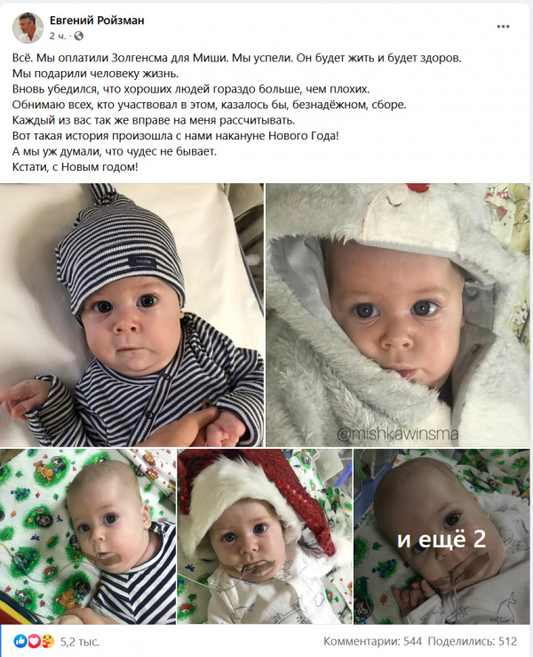 Кстати, рад сообщить отличную новость от Евгения Ройзмана: мы все вместе совершили новогоднее чудо - подарили жизнь ребенку.
