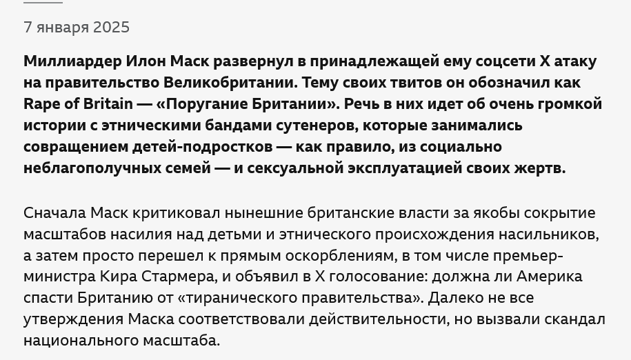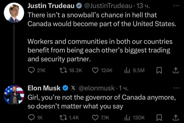 нет, у Маска гораздо тоньше:Маск написал "ты больше не губернатор Канады" (а Трюдо им и не был), так что тут хамства как бы и нетТипа, "мы с Дональдом посовещались и уволили тебя с поста губернатора Канады".Он просто прикололся, хамства ноль