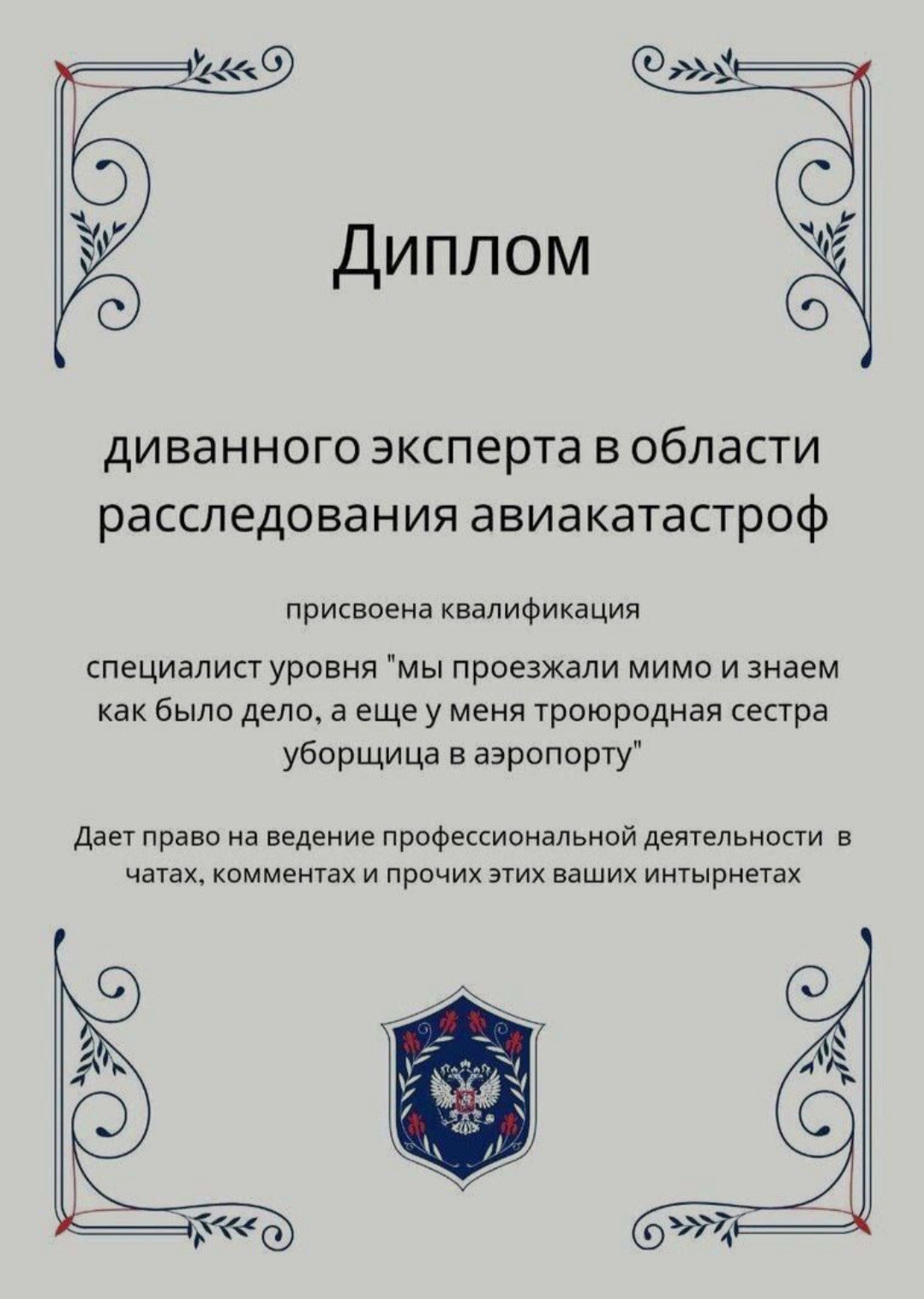 Не, мне тогда больше нравится версия с Кадыровым - ему сначало позвонили военные, затем он позвонил диспетчерам и приказал - отправить самолет тонуть в море 😄