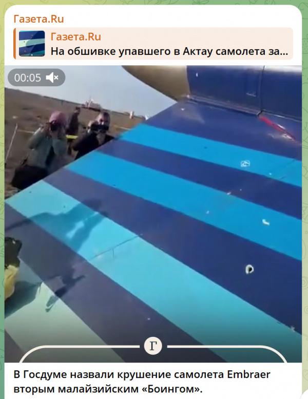 В Euronews пишут как о доказанном факте, что потерпевший крушение самолет в Актау был подбит российской ракетой ПВО класса "земля-воздух" над Грозным. В статье не пишут о том, почему самолету при этом не разрешили сесть на территории РФ - там недалеко находилось несколько аэродромов, которые могли принять самолет, из-за чего самолету пришлось пересекать Каспий, но большинство военных экспертов, которых я слушал и читал, считают, что это было сделано намеренно по указанию Кадырова, чтобы самолет упал в море и было бы невозможно точно узнать, что с ним произошло.
