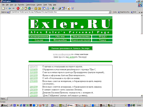 Ну да, сайту Exler.ru исполнилось 14 лет. Формально он был создан летом 1997 года, но в ипостаси авторского проекта открылся 14 января 1999 года - вот первая запись, и по ним можно двигаться на 14 лет вперед. Сейчас эти старые записи читать, конечно, смешно, но я их не собираюсь убирать: в конце концов, это тоже какая-никакая, но история. Сайт тогда выглядел вот так.