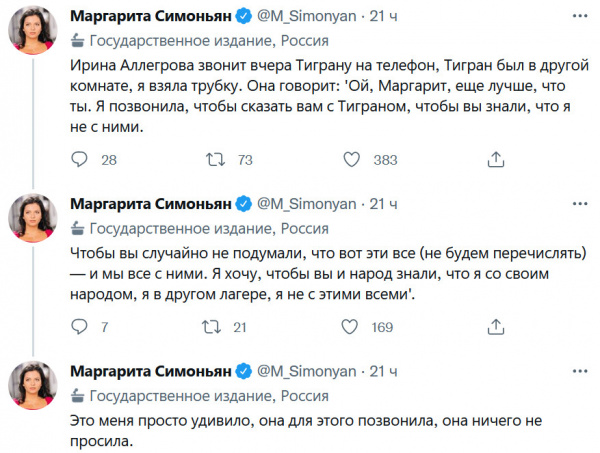 При всем моем предвзятом отношении к творчеству и личности Аллегровой, обсуждать ее позицию по скрину Твиттера симоньян мне кажется странным. А позиция самой Аллегровой кому-то известна из первоисточника?