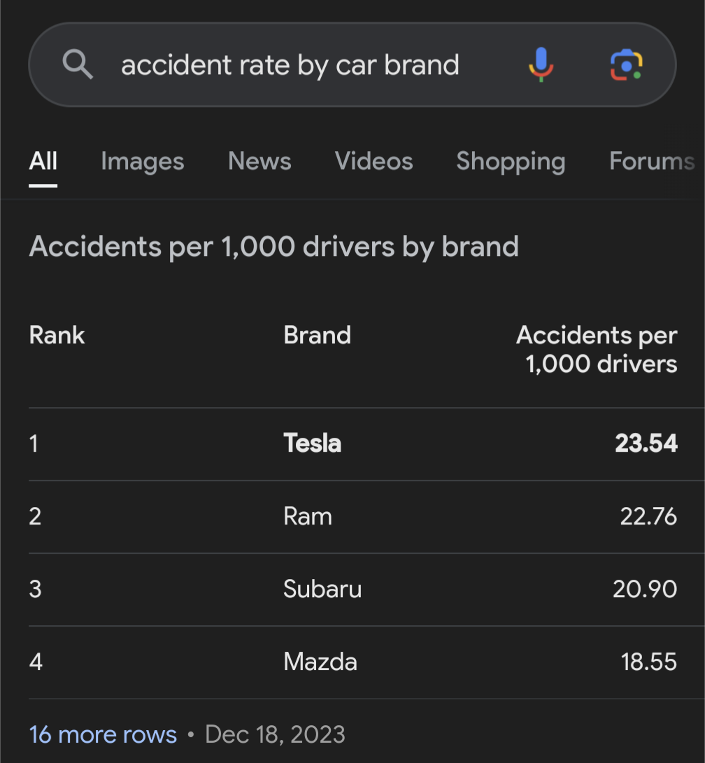 Если погуглить "accident rate by car brand* то Тесла оказывается на первом месте. Забавно.
