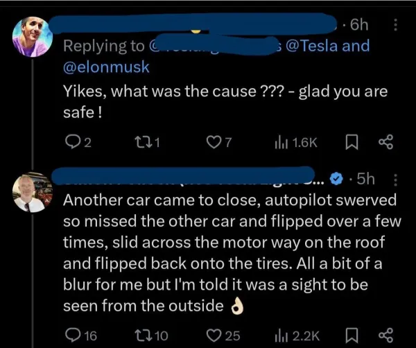 Мужик, похоже, от шока не может вспомнить детали и связно написать, но судя по его сообщениям в той ветке на X, автопилот просто резко ушёл от другой машины, а водитель испугался, попытался выправить, и сделал только хуже, зацепив то ли канаву, то ли ещё что, из-за чего машина пошла кувыркаться.