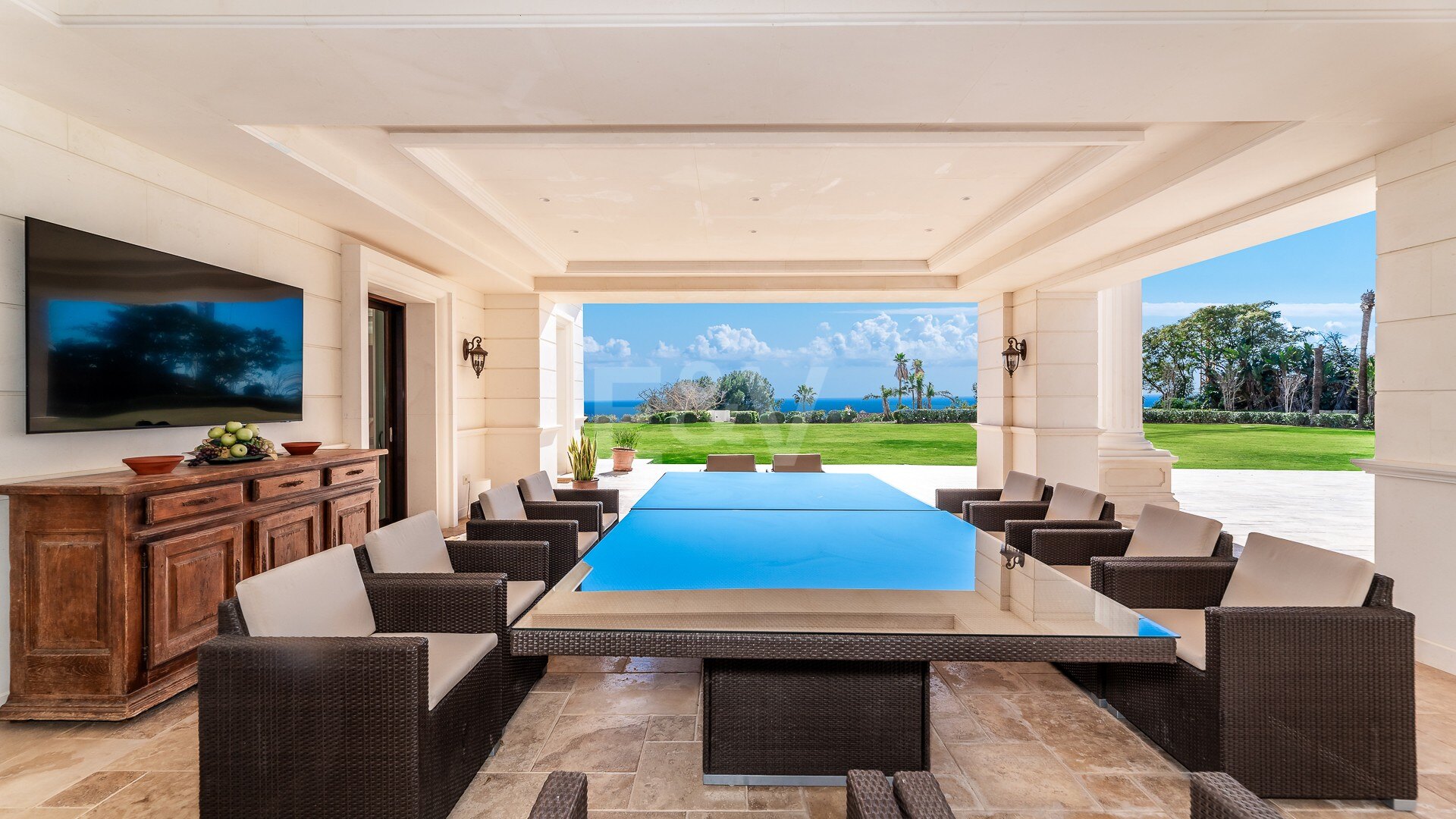 При входе в дом вы будете поражены видом на море с видом на бассейн, и вас автоматически потянет на крытую террасу, чтобы насладиться этими удивительными видами.