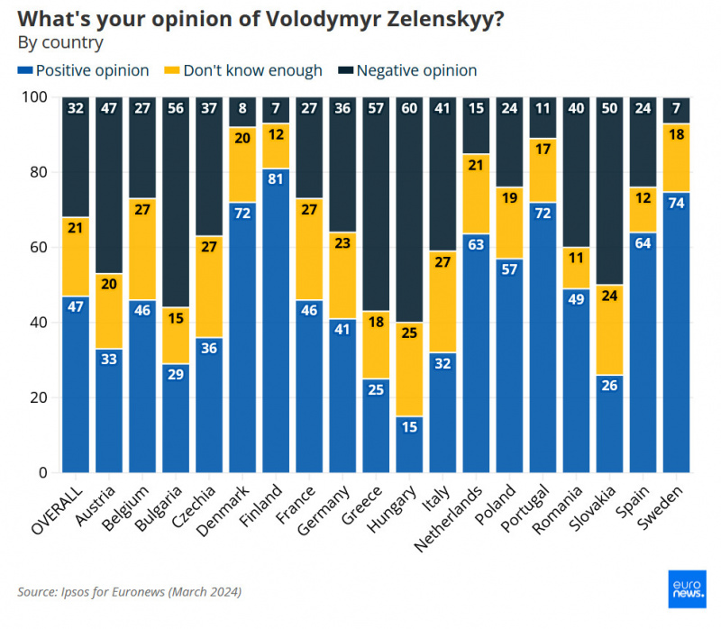 Первый в своем роде опрос показал, что 47 % европейцев придерживаются "положительного" мнения о Владимире Зеленском, в то время как 32 % - "отрицательного". В то же время 21 % заявили, что "недостаточно знают" о президенте, который в течение последних двух лет занимал первые строчки газет и много ездил по всему континенту, выступая от имени своей разрушенной войной страны.