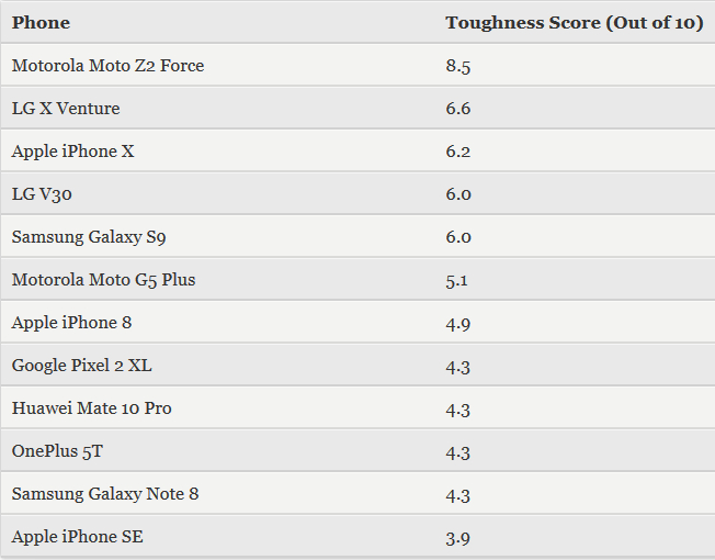Ну и вот эта табличка. На первом месте Motorola Moto Z2 Force. Почти неубиваемый. На третьем месте Apple iPhone X и от него почти не отстают LG V30 и Samsung Galaxy S9. (У моего Samsung Galaxy S8+, напомню, надбился уголок, когда смартфон в защитном чехле упал с высоты нескольких сантиметров на клавиатуру.)