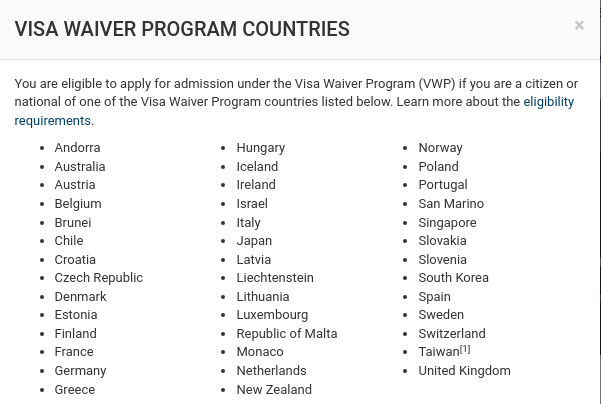 В США без визы сейчас можно почти из любой страны ЕС и других стран, которые входят в Visa Waiver Program (полный список ниже).