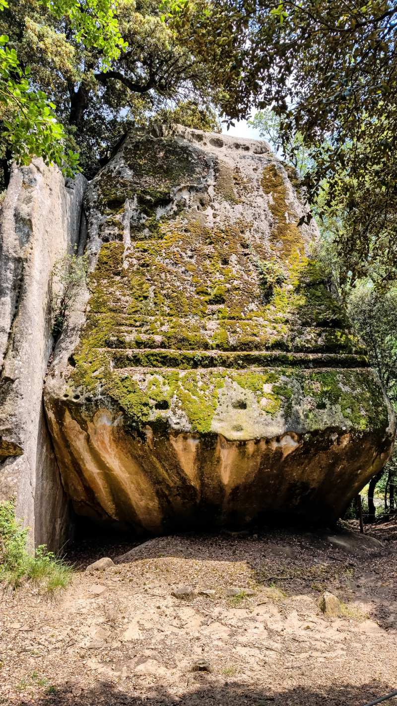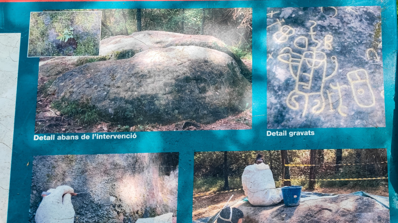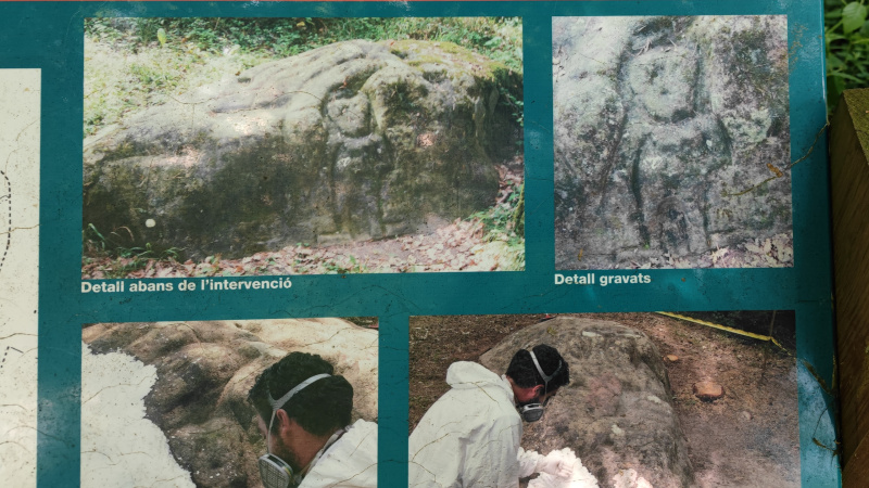 На это место мы наткнулись случайно. Ехали посмотреть какую-то церквушку в городке неподалеку от отеля, и по дороге в стороне увидели человека, стоящего на краю скалы. Раз человек стоит, подумали мы, значит, туда можно как-то добраться, а виды оттуда должны открываться отличные. Посмотрели по карте - да, достопримечательности: какие-то древние глыбы с надписями, а на верхушке скалы стоит эрмита (по-французски - эрмитаж), то есть хижина отшельника, она же часовня.