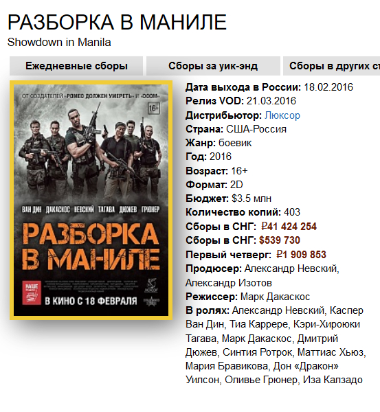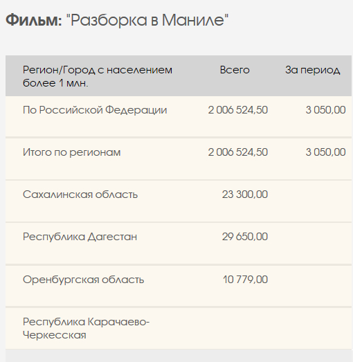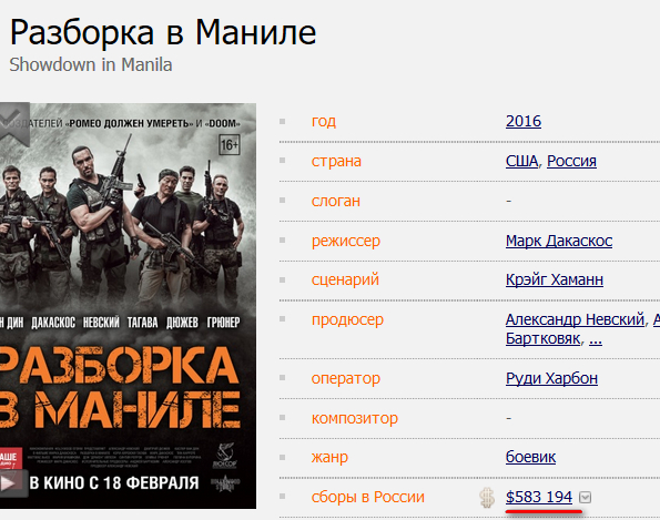 Вот примеры. Берем ту же несчастную "Разборку в Маниле" (уж простите меня за это). Что там на сайте "Кинопоиска"? $583 тысячи. Во что верится слегка с трудом.