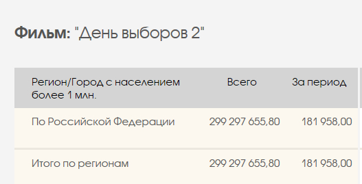 Да здрассте приехали. Это вполне известные данные на соответствующих ресурсах. Также как и во всем мире, кстати. В Штатах посмотреть реальные цифры проката - раз плюнуть. Поэтому, кстати, Саша (и остальные такие же "режиссеры") круто палится, когда заливает о том, что в Штатах его говнецо кто-то смотрит. Это проверить - дело двух секунд.