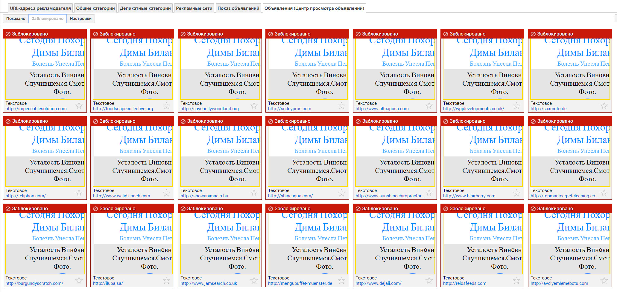Все наверняка натыкались на эти дебильные баннеры "Сегодня похороны Димы Билана", которые постоянно вылезают в Google Adsense. Причем эти баннеры, как правило, рекламируют какие-то вроде вполне нормальные западные сервисы. Видимо, какая-то рекламная шарашка таким образом накручивает посещаемость сайтов, а вот почему к этой шарашке вообще обращаются - то мне неведомо. Также я не очень понимаю, почему Adsense с ними никак не может справиться - они уже с год так развлекаются.