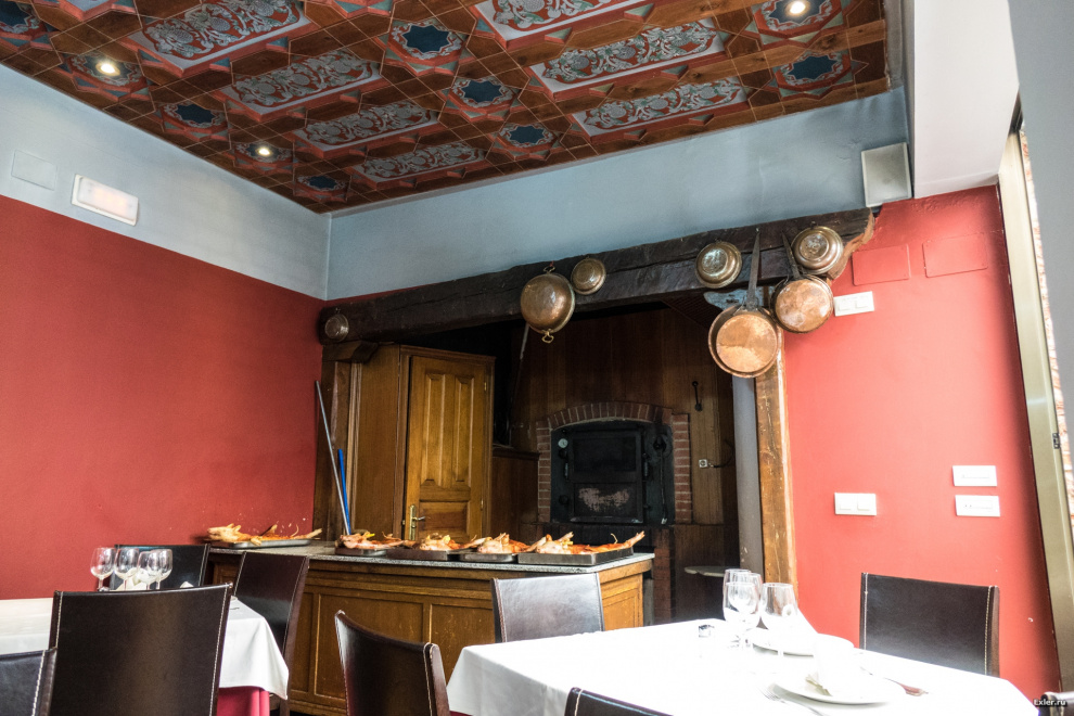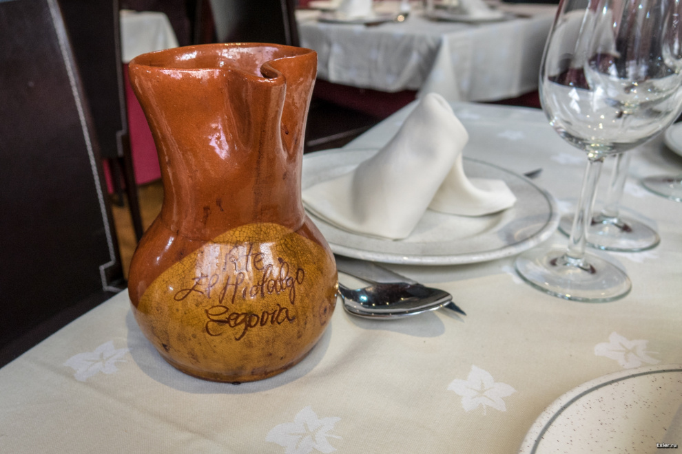 Но мы-то зачем сюда приехали? За молочными поросятами. Их подают почти в каждом ресторане города, но самый известный из них - вот этот, на фото. Он называется Meson de Candido el Segoviano, что переводится как "Гостиница Кандидо, сеговианца". Кандидо - это фамилия владельца гостиницы и ресторана - дедушки Кандидо. Ему лет сто двадцать, он имеет титул Главного Ресторатора Кастильи, о чем у него на пузе сообщает медаль размером с тарелку для разделки поросят.