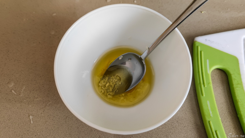 В плошку наливается пара-тройка ложек оливкового масла для жарки, в него выдавливаются две дольки чеснока. После этого масло с чесноком как следует перемешать. Как вариант - можно добавить еще ложку соевого соуса и немного бальзамико (кому что нравится, мне нравится и так и так).