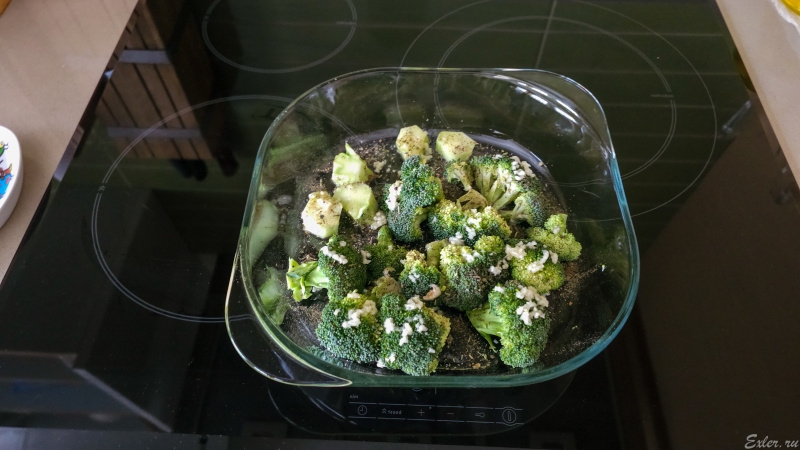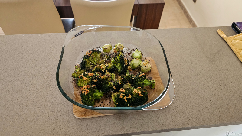 Разогреваем духовку (верхний и нижний нагрев) до 230 градусов, после чего туда помещаем емкость примерно на 20 минут. (Ближе к величественному финалу желательно контролировать процесс, и доставать брокколи по готовности.)