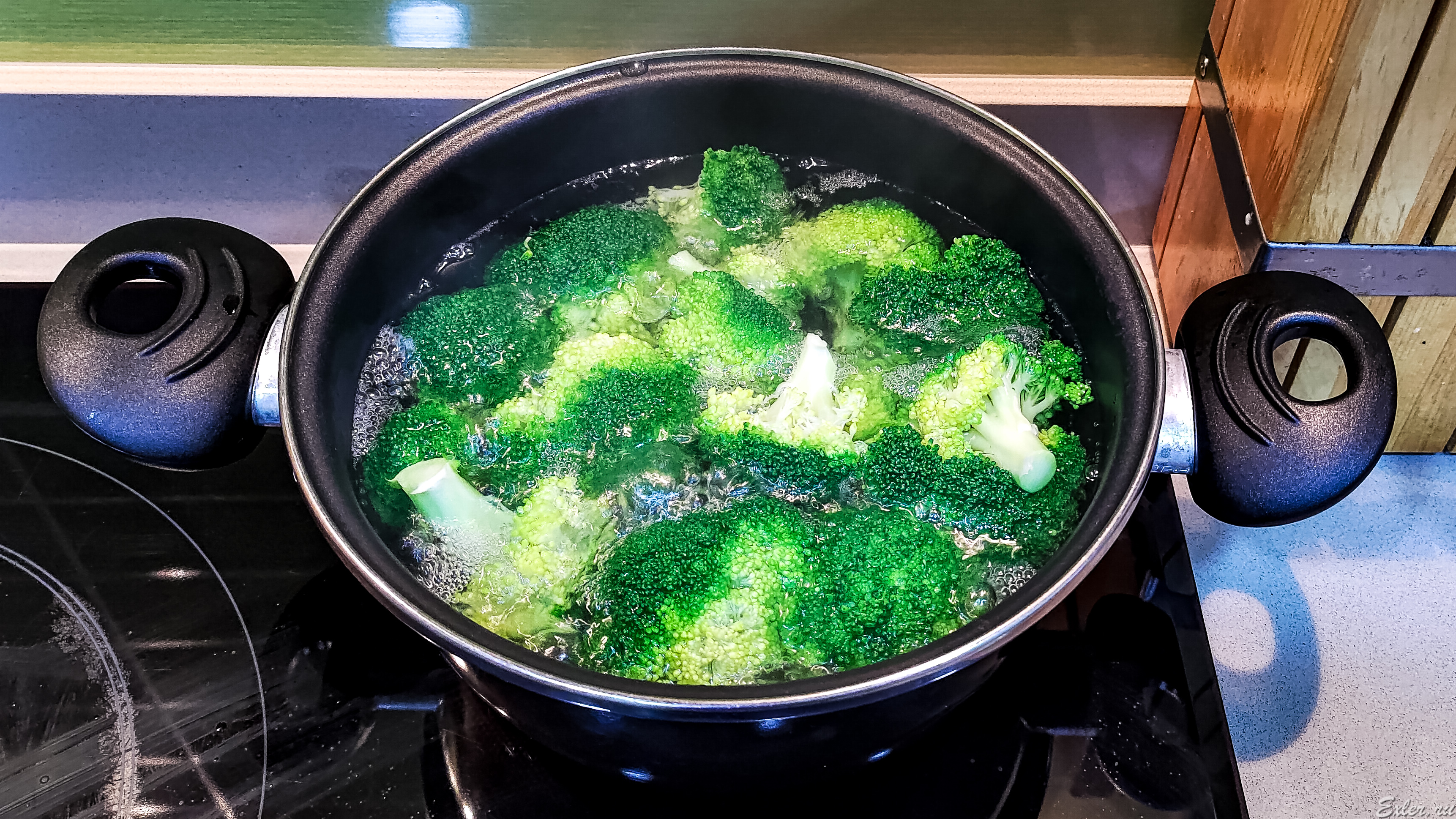 Берем брокколи. Нежно разбираем на соцветия. Кипятим воду, солим, кидаем в кипящую воду брокколи, варим не больше трех минут, после чего брокколи откидываем в дуршлаг и обдаем холодной водой.
