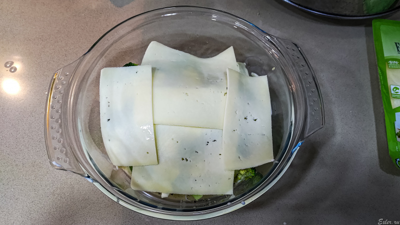 Кладем брокколи в емкость для запекания, заливаем заливкой. Если твердого сыра для натирания нет, а есть только порезанный на кусочки бутербродный, тогда выходим из положения так, как мы с котом Бубликом - кидаем эти куски сыра сверху.