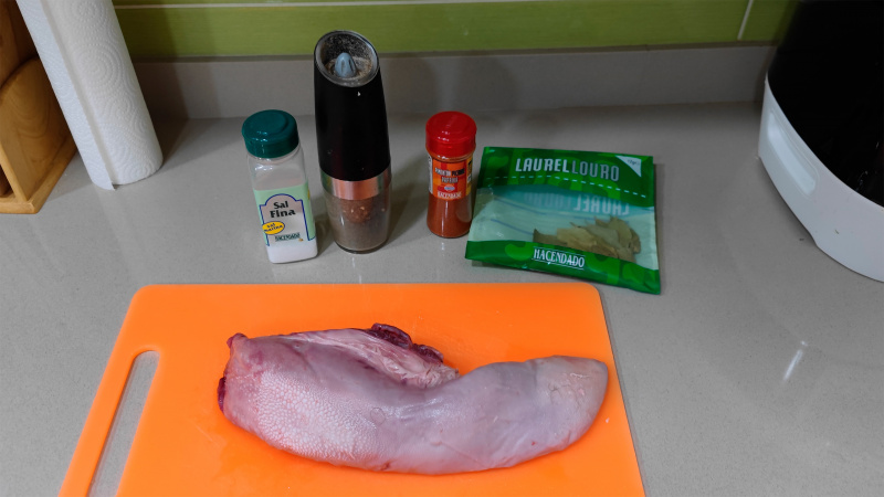 Вместе со столовой ложкой соли смешивается черный перец из мельнички (я использую только такую, как на снимке), паприка и розмарин (несколько иголок). Полученной смесью натирается язык, к нему добавляется пара листиков петрушки, это все запаивается в вакууматоре (кстати, именно этот вакууматор нам прекрасно служит до сих пор, а мы с женой им пользуемся постоянно) и отправляется в холодильник в отделение для мяса на три дня.