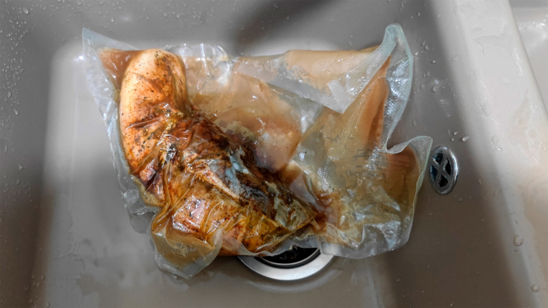 Наливаете воду в чашу. ХОЛОДНУЮ воду. Мясо помещаете в пакет или пленку - максимально выдавив воздух.