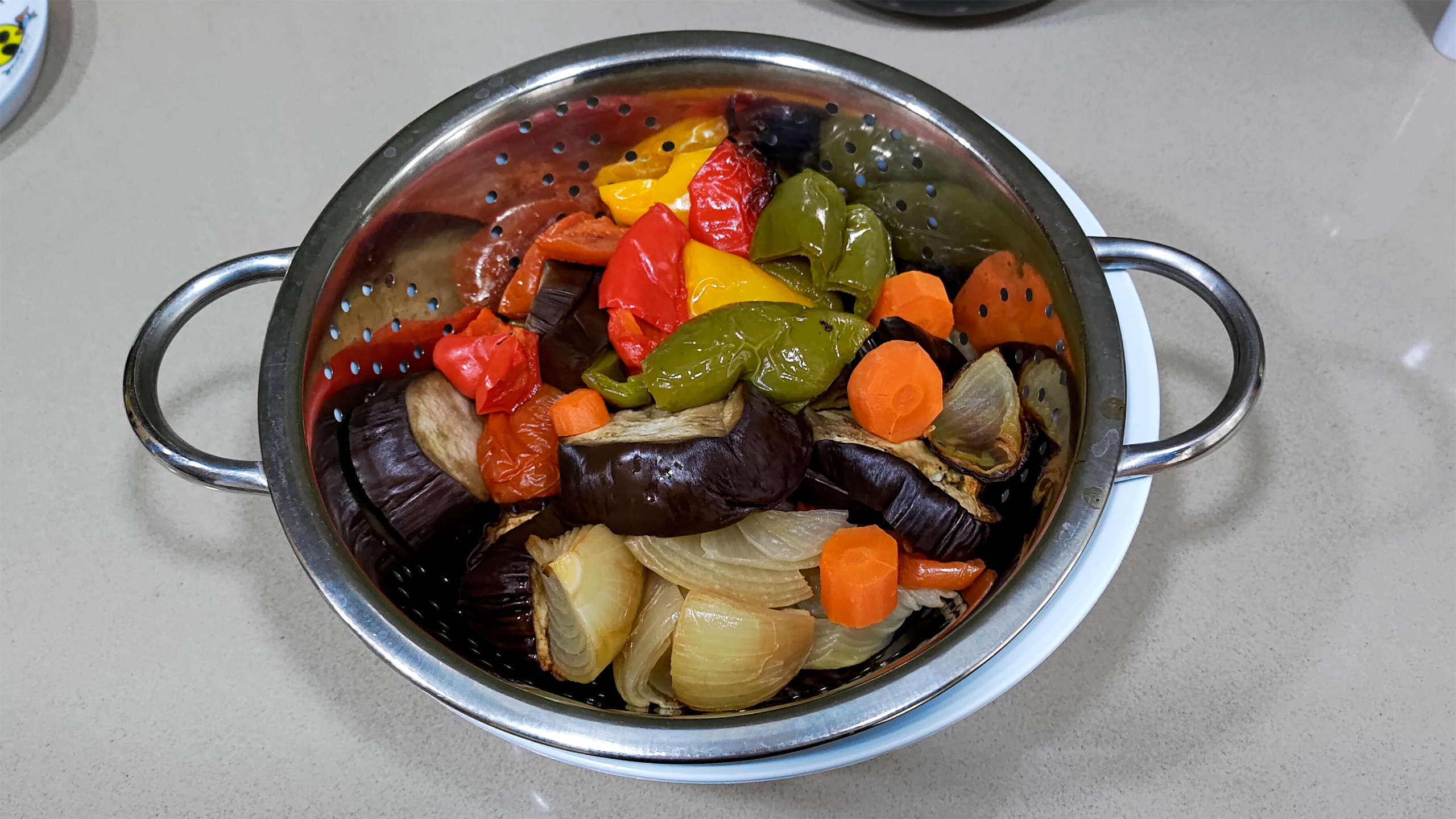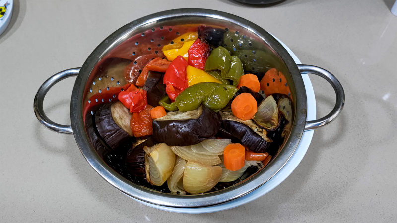 Два немаленьких баклажана, три сладких перца (мы берем набор "светофор": красный, желтый и зеленый), одна крупная луковица, одна крупная морковка, пара помидоров. Можно также добавить кабачок/цуккини, но нам не нравится добавлять кабачок/цуккини, поэтому мы его и не добавляем - свобода творчества!
