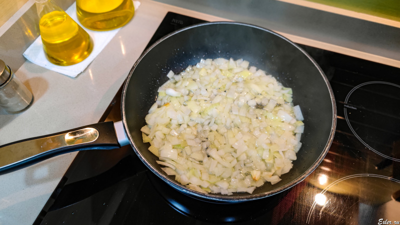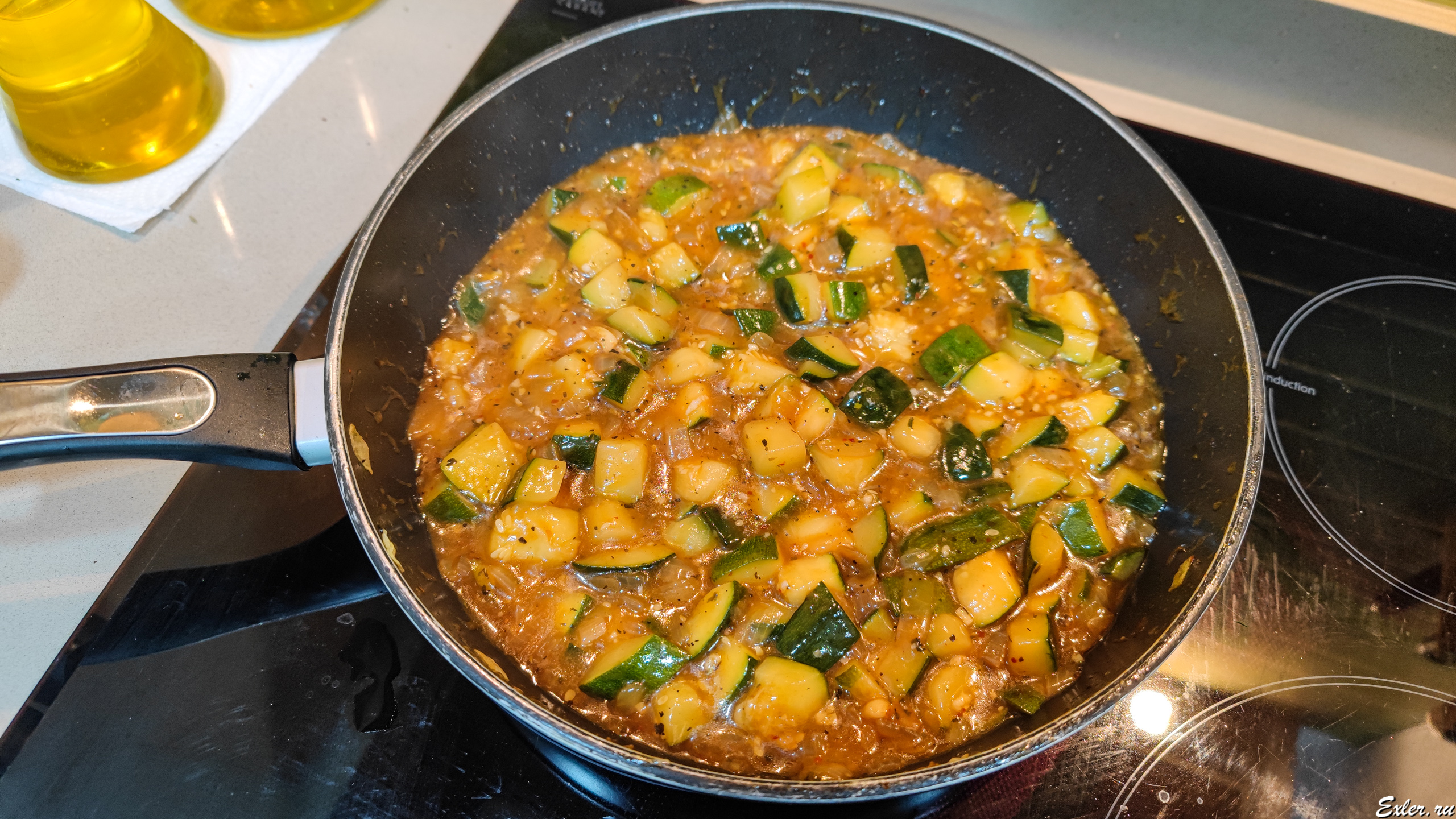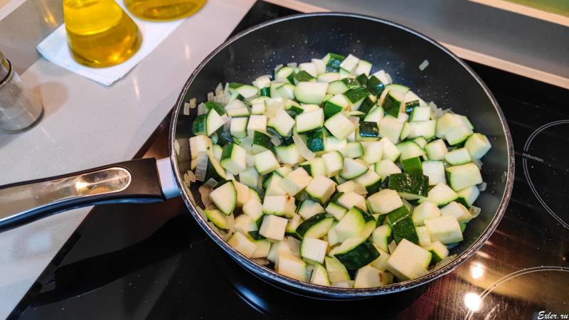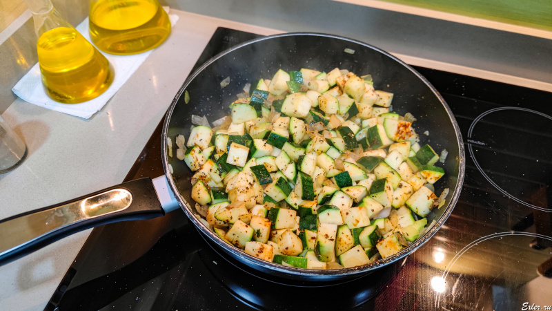 Кабачок режем небольшими кубиками, закидываем в сковородку и вместе с луком обжариваем на сильном огне (кабачок выделит немало жидкости, которую желательно выпарить), часто помешивая. На это уйдет где-то минут десять.
