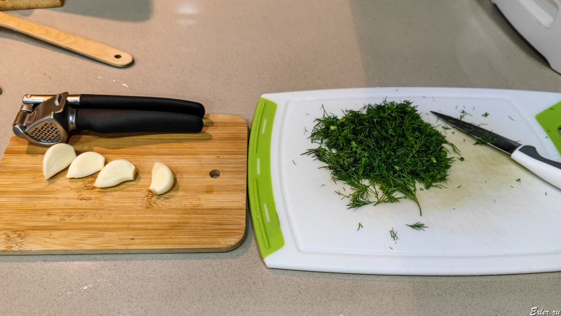Берем несколько долек чеснока (если не хочется слишком остро - пару долек, но я беру четыре), также можно порезать укроп. (Впрочем, резанный укроп можно добавить и в готовое блюдо.)