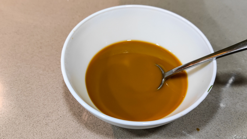 За это время готовим несложный соус. В плошку наливаем примерно четверть стакана воды, туда насыпаем столовую ложку кукурузного крахмала, сразу же как следует перемешиваем (чтобы крахмал не сбился в комочки), туда вливаем две столовых ложки соевого соуса. Также можно добавить где-то половинку чайной ложки молотого имбиря, но если имбиря нет - и без него будет хорошо. Все это как следует перемешиваем.