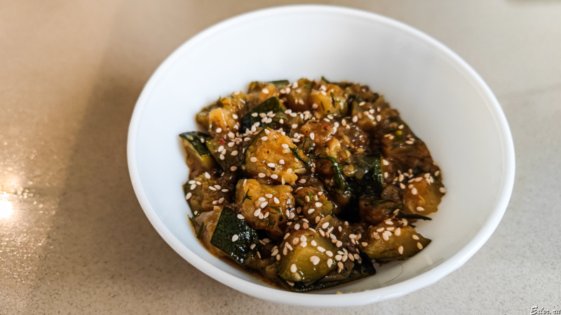 Получившееся блюдо, по идее, нужно употреблять холодным, однако я после готовки одну порцию съедаю горячей, и это тоже очень и очень вкусно. После этого блюдо кладется в контейнер, ставится в холодильник, и потом можно есть холодным - это вообще бомба! Хорошая мысль - посыпать перед едой семечками кунжута.