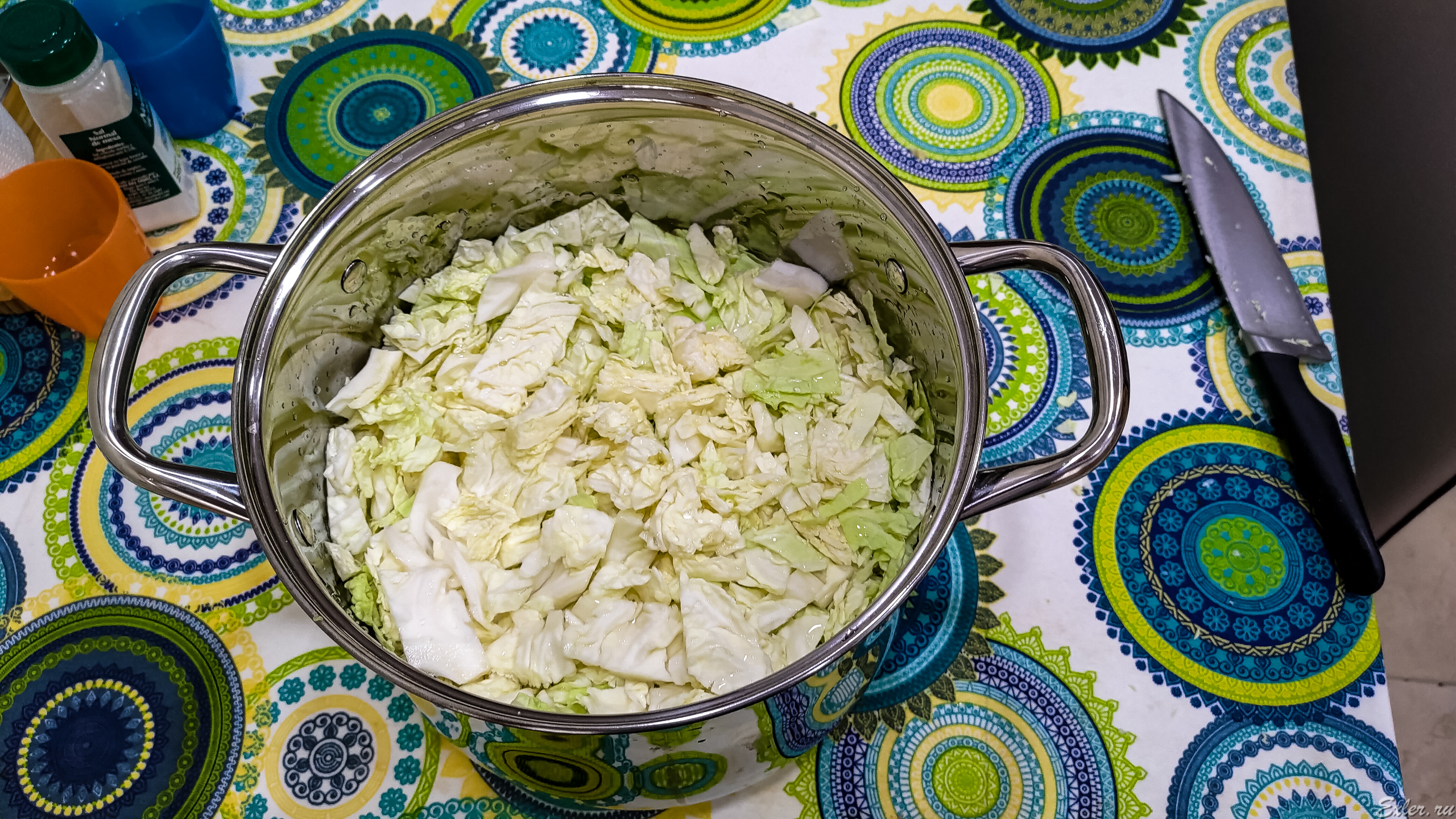 Укладывать капусту нужно в какую-то емкость, желательно железную или стеклянную: я для этого купил у китайцев шестилитровую кастрюлю: с запасом, чтобы рассол не перелился при квашении.