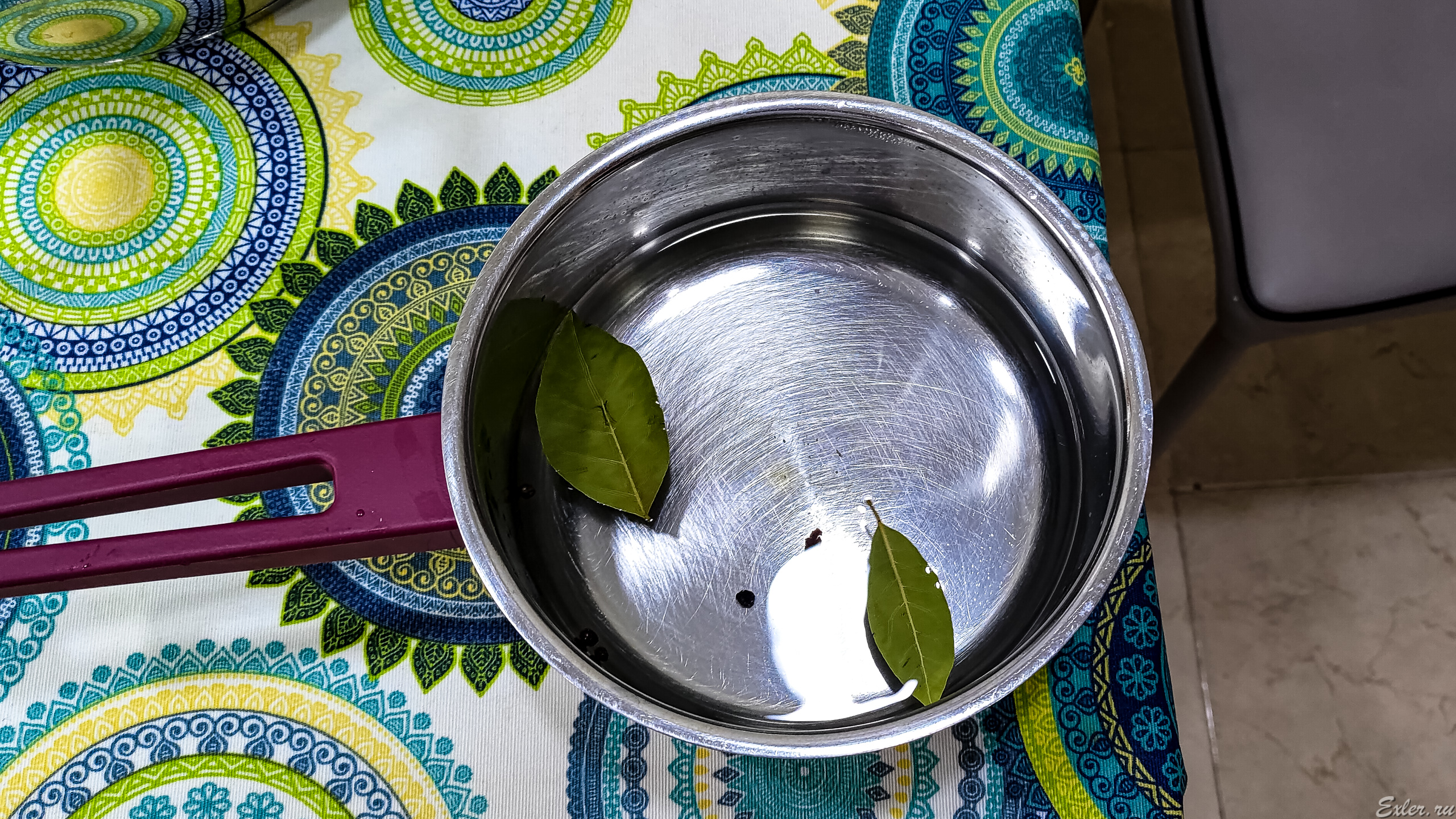Берем два литра теплой воды (литр на кило) и готовим рассол. Вода может быть кипятком, но ее потом обязательно нужно будет остудить. В воде растворить - крупную соль безо всяких йодистых добавок из расчета одна столовая ложка на килограмм капусты. Во многих рецептах также фигурирует точно такое же количество сахара на килограмм капусты, однако я на два килограмма беру две чайных ложки сахара, а не две столовых. И сахар я кладу вовсе не для вкуса, а чтобы он ускорил процесс ферментирования: без сахара просто дольше будет готовиться. Также в воду кидаем пару лаврушек и несколько горошин черного перца. Можно также добавить и душистый перец, только в Испании мы его пока не обнаружили. (Да это на самом деле и не перец вовсе, просто в России его так называют.)