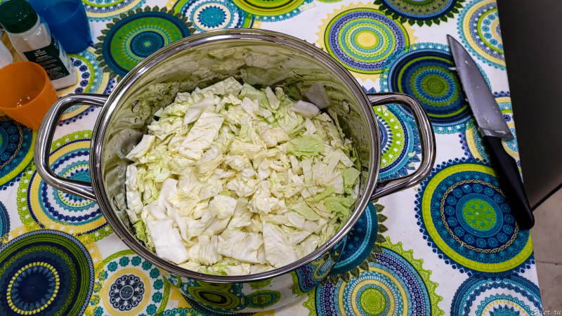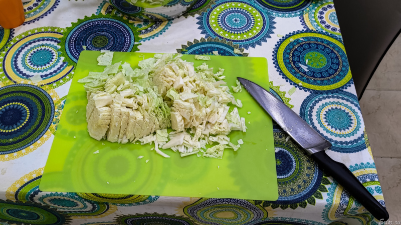 Каждый шинкует капусту так, как он привык: одни используют шинковку, другие мелко режут ее хлебным ножом с пилкой, я использую большой нож с крупным полотном: мне очень мелко резать не нужно, и так получается довольно быстро. Но, впрочем, хочу также как-нибудь попробовать вот такую шинковку, которую мне несколько раз уже рекомендовали: она куплена, но еще до меня не доехала. Попробую потом с ней, но меня и мой способ вполне устраивает.