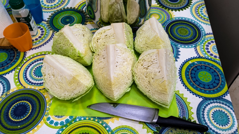 Каждый кочан разрезается на четыре части - так удобнее всего шинковать, да и кочерыжку удалить намного проще.
