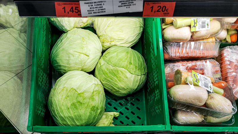 Первые эксперименты мы проводили вот с этой капустой из "Меркадоны": именно ее мы обычно покупали для супов и для тушения.