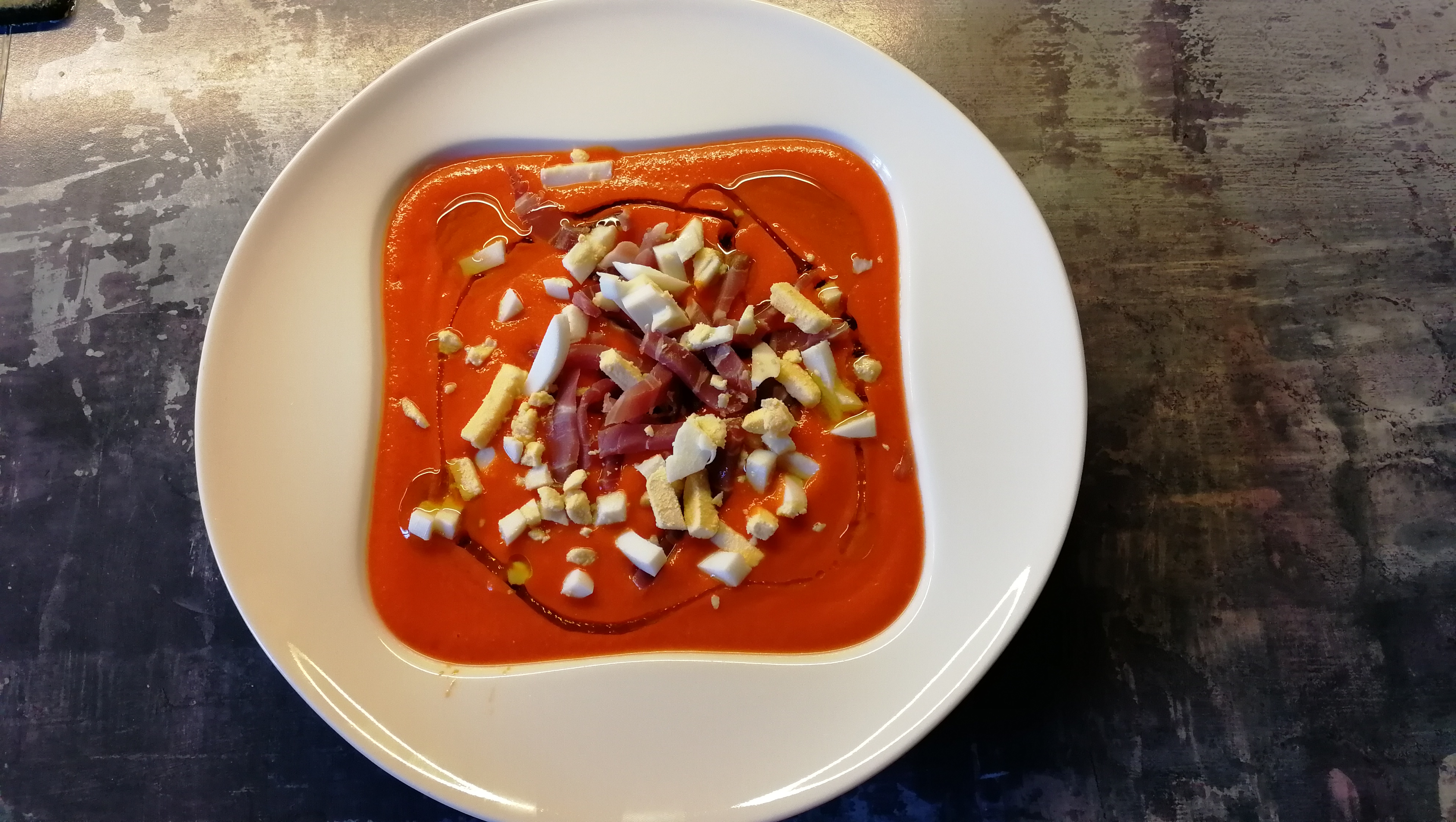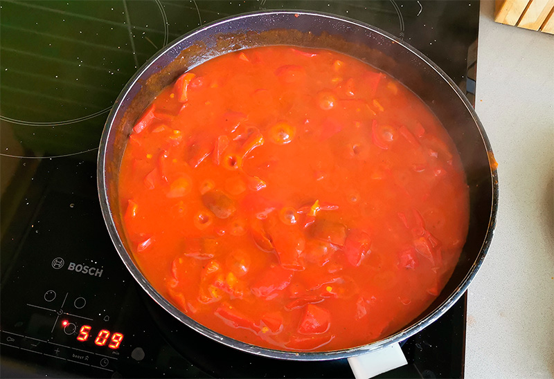 Теперь, когда перцы должным образом протомились, достаем банку измельченных томатов (в Испании они постоянно используются в готовке и их тут видов, наверное, сто), всю банку (поллитровую) выливаем туда, хорошенько это все промешиваем и оставляем протушиться еще минут на 10-15.