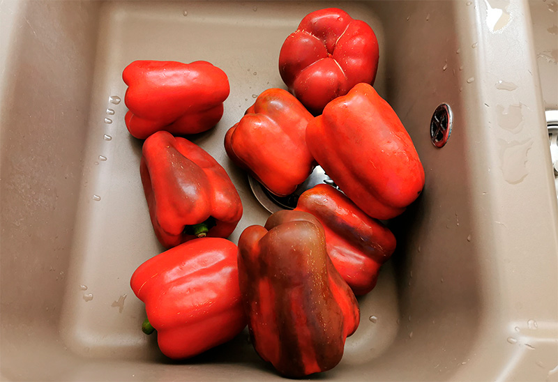 Итак. Берем штук 6-8 мясистых красных перцев. (Допускаются также зеленые или желтые, но мы предпочитаем красные.)