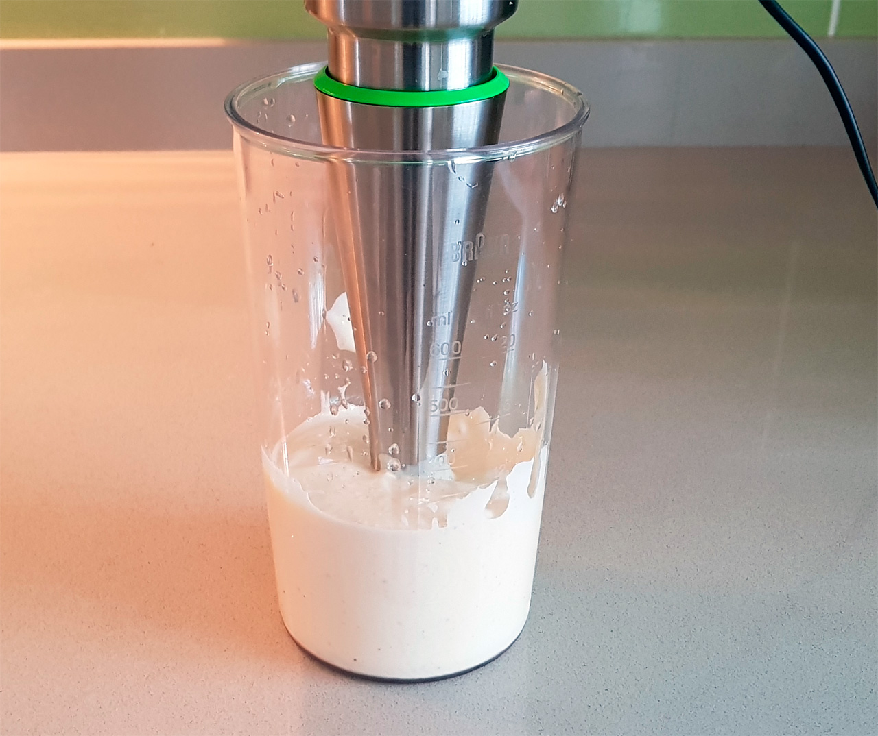 Но так как мы, простые деревенские пареньки, все эти мишленовские задвигоны шлем лесом к такой-то французской бабушке, наш домашний майонез в течение минуты превосходно взбивается и смешивается ручным блендером подходящей мощности. Я использую ручной киловаттный блендер MQ9045X Aperitive, но, разумеется, тут подойдет любой другой подобный блендер.