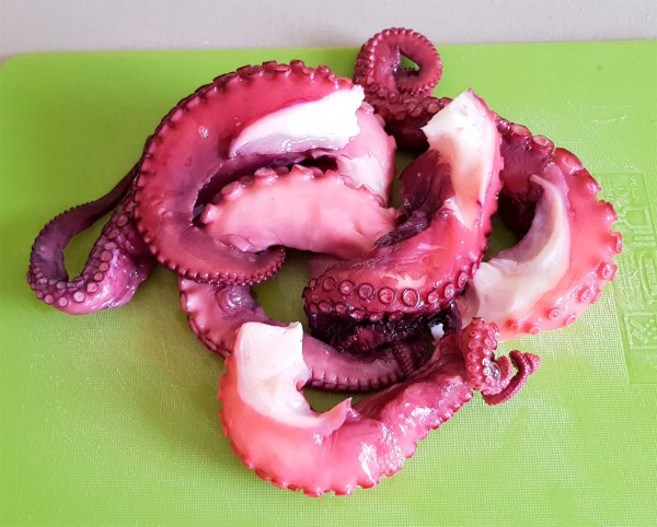 Берем вареного осьминога. Можно взять и сырого, но с ним на порядок больше возни: сначала надо замораживать, потом варить черт знает сколько часов. Лучше взять готового вареного - в Испании продается на каждом шагу.