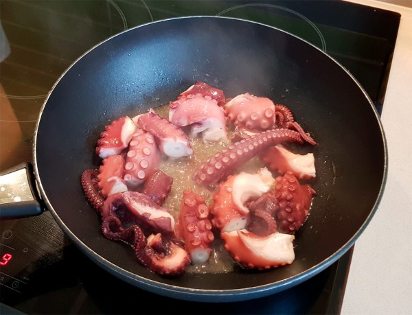 Когда осьминог и лук обжарятся (обычно это занимает минут десять), осьминог солится, перчится черным и красным перцем, для остроты можно добавить чуть-чуть кайенского перца, после чего туда кидается пара давленных долек чеснока, вливаются томаты (или томатная паста), хорошенько перемешивается и ставится под крышку на маленький огонь на 20-30 минут.