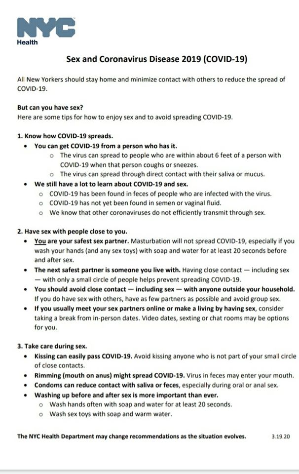 • Вы – ваш самый безопасный секс-партнер. Covid-19 не передается при мастурбации, особенно если вы помоете руки (и используемые секс-игрушки) в воде с мылом, по крайней мере, в течение 20 секунд, причем как до, так и после секса.