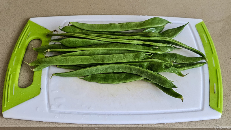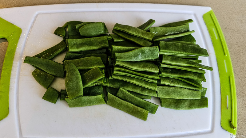 Учитывая то, что мы стручки варить не будем, их имеет смысл порезать на несколько частей - для удобства приготовления и последующего съедения Я обычно режу их на 3-4 части.