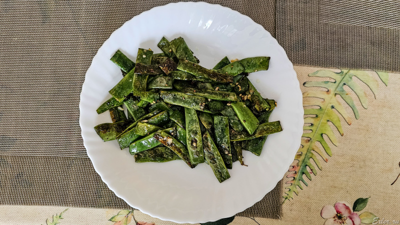 Когда стручки будут готовы, нужно очистить пару долек чеснока, выдавить чеснок прессом на стручки, как следует перемешать и, не обжаривая дальше, выложить стручки в тарелку. Так как их не варили, стручки сохранили свою текстуру, слегка похрустывают, но при этом они вполне готовы. И получается прям очень вкусно: мы теперь это блюдо делаем раза 2-3 в неделю. Так что попробуйте - может, и вам понравится!