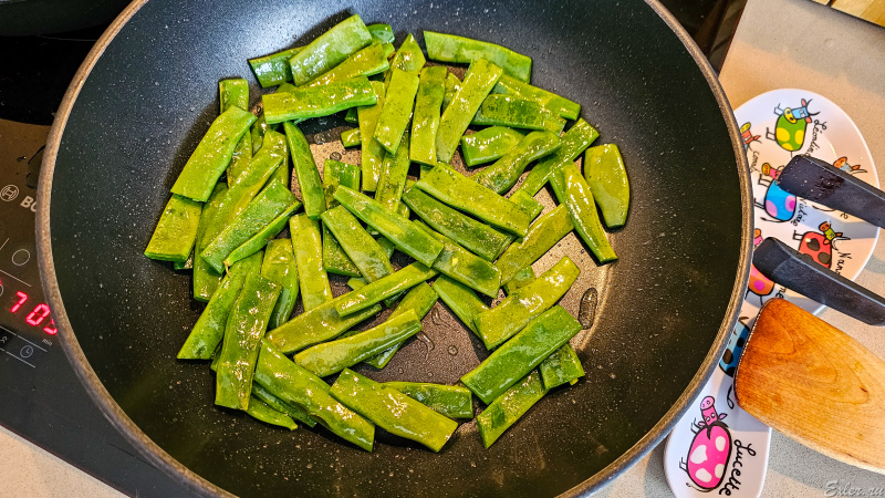 Возвращаемся к нашим баранам, то есть нашей фасоли. Стручки нужно обжаривать на достаточно сильном огне, часто помешивая, в течение примерно 10-12 минут. В процессе жарки посолить и поперчить по вкусу.