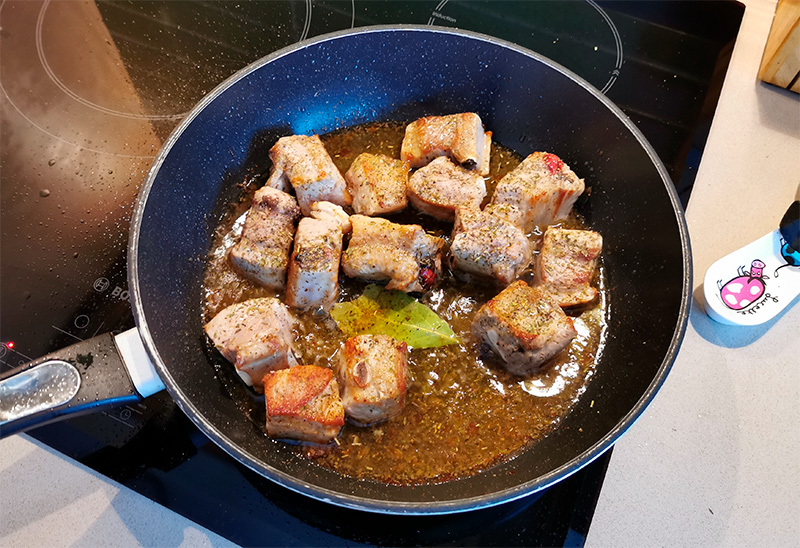 Все это хорошенько нужно перемешать и снова поставить тушиться под крышку. В испанском рецепте достаточно 10 минут. Мне результат совершенно не понравился, мясо было жестковато. Тогда в следующий раз я блюдо на этом этапе протушил полчаса. Результат был заметно лучше.