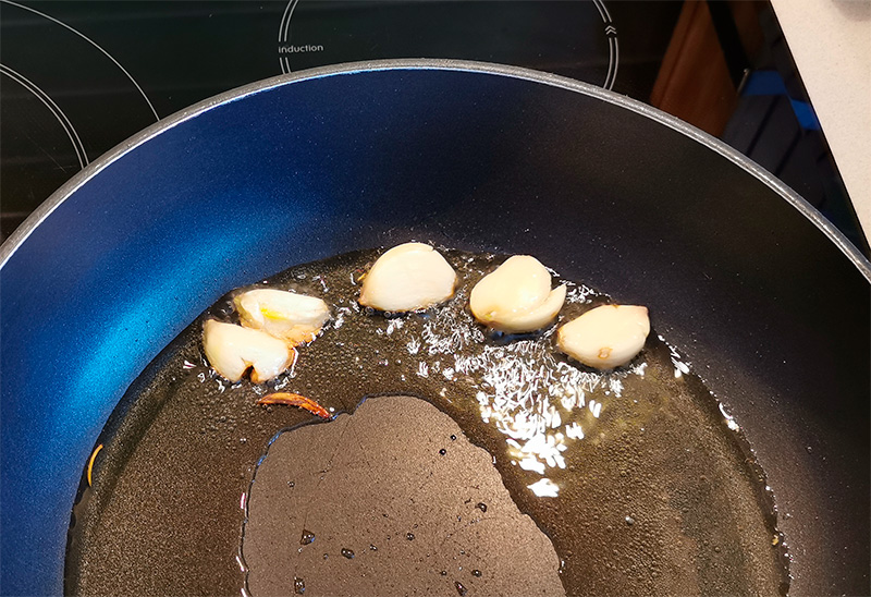 Наливаем в глубокую сковородку оливковое масло для жарки, кидаем туда четыре раздавленных дольки очищенного чеснока. (Напомню, что нечищенную дольку нужно раздавить плоскостью ножа - тогда она очистится очень быстро.)
