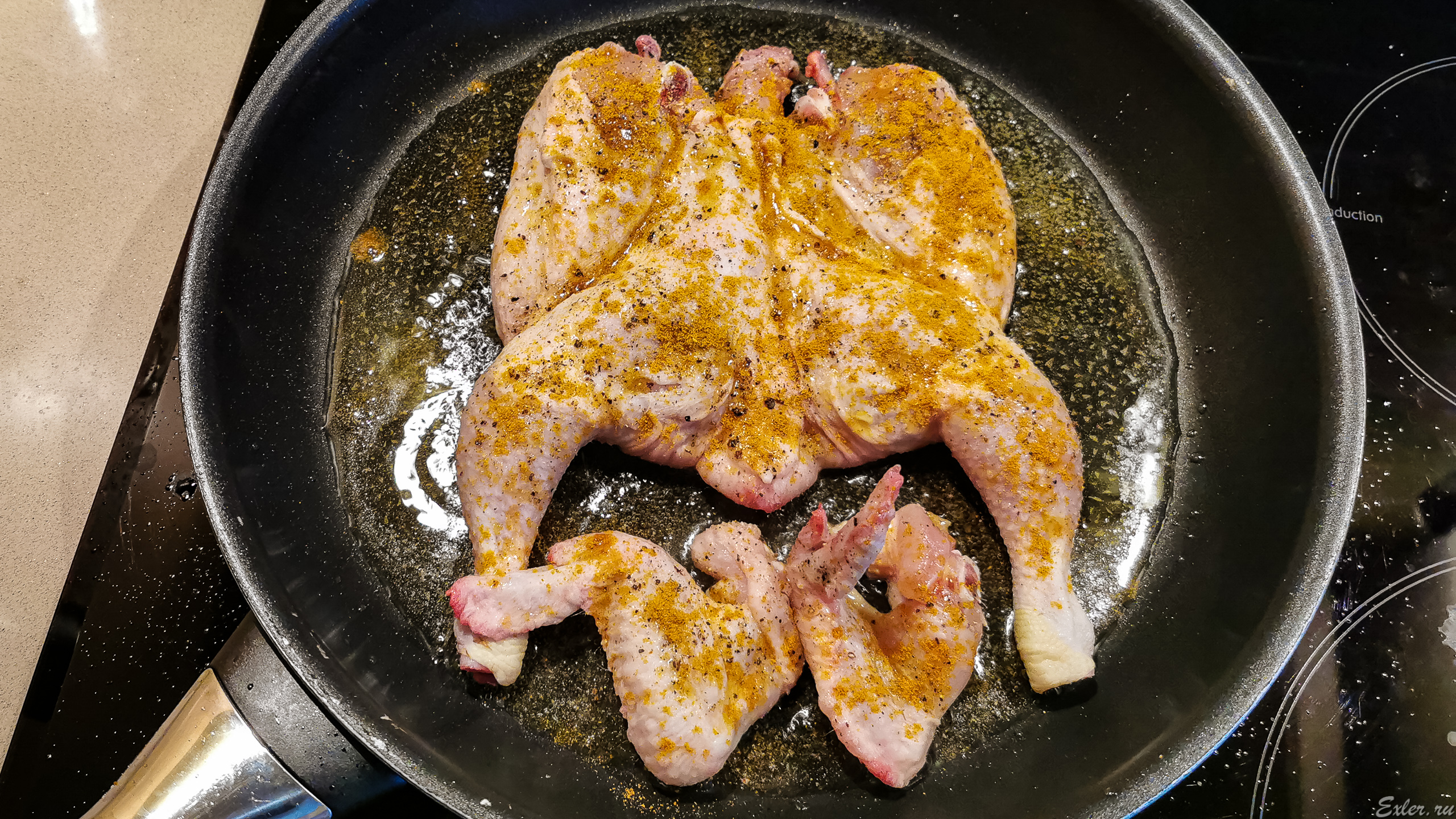 Я бы в процессе жарки положил бы на цыплёнка гнёт, а сверху наборные гантели из предыдущего поста. )