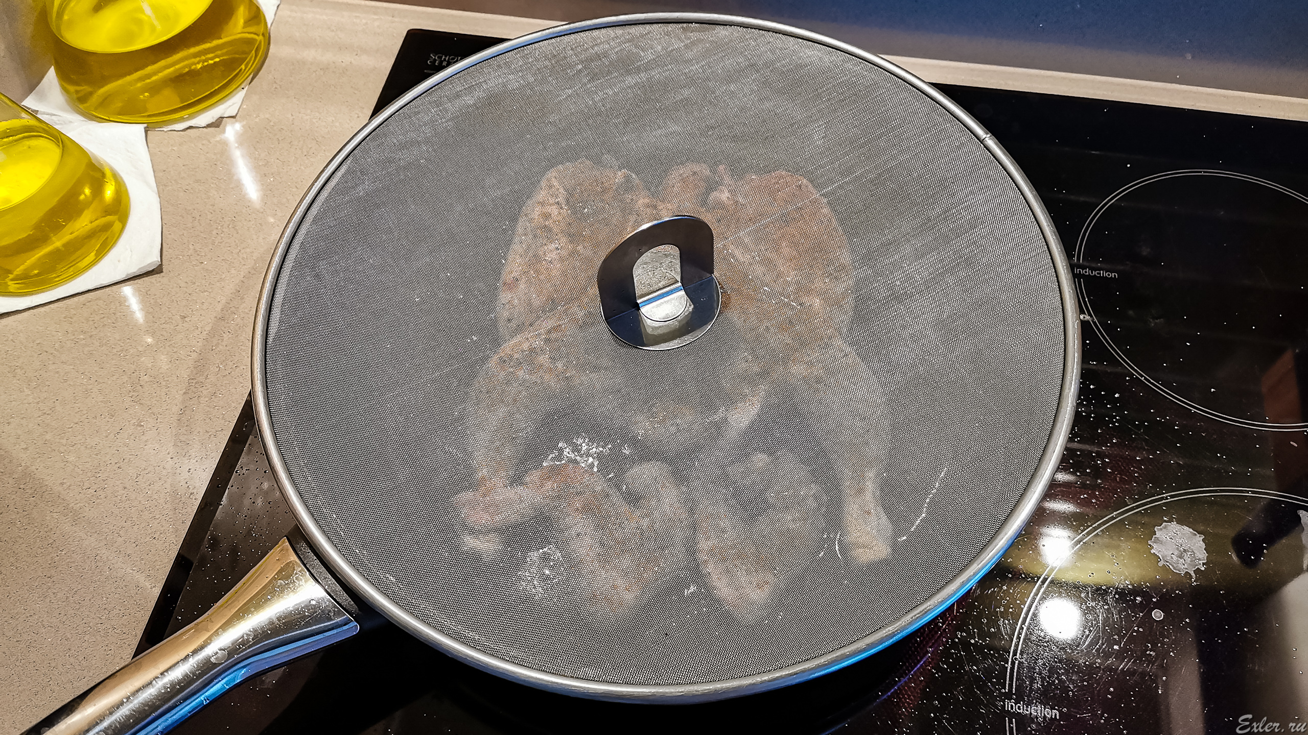 Сковородку при этом хорошо накрыть сеткой, чтобы не забрызгать жиром все вокруг.