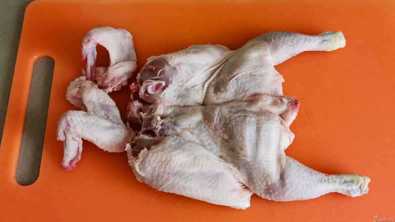 Разрезаем ее вдоль грудины так, чтобы тушку можно было распластать на сковородке. Также отрезаем крылья - чтобы они не мешали жарить тушку сверху.